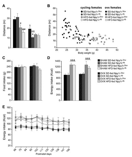 2.2. Npy1r Gene Inactivation Decreased Locomotor Activity but Failed to Affect the Food Intake of SD- and HFD-Fed Cycling and Ovariectomized Female Mice