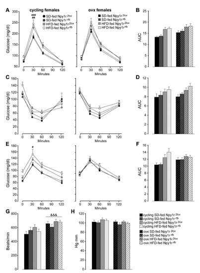 Glucose homeostasis and metabolism of standard diet (SD)- and high-fat diet (HFD)-fed cycling and ovx Npy1r2lox control and Npy1rrfb knockout female mice (A–F). (A) Glucose tolerance tests and (B) area under the curve (AUC) of SD- and HFD-fed cycling and ovx Npy1r2lox and Npy1rrfb females. Data are the mean ± SEM; n = 11–20 from 3 litters. ## p < 0.01 HFD-fed versus SD-fed cycling controls; ### p < 0.001 HFD-fed versus SD-fed cycling Npy1r2lox female mice. (C) Insulin tolerance test and (D) area under the curve (AUC) of SD- and HFD-fed cycling and ovx Npy1r2lox and Npy1rrfb females. Data are the mean ± SEM; n = 7–15 from 2 litters. (E) Pyruvate tolerance test and (F) area under the curve (AUC) of SD- and HFD-fed cycling and ovx Npy1r2lox and Npy1rrfb females. Data are the mean ± SEM; n = 7–16 from 2 litters. # p < 0.05 HFD-fed versus SD-fed cycling Npy1rrfb females. (G) Heart rate and (H) blood pressure of standard diet (SD)- and high-fat diet (HFD)-fed cycling and ovx Npy1r2lox control and Npy1rrfb knockout female mice. &&& p < 0.001 versus cycling females.