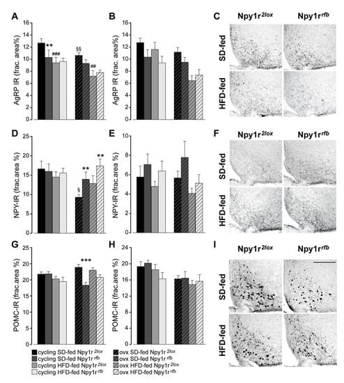 Expression of neuropeptides in the ARC and PVN of standard diet (SD)- and high-fat diet (HFD)-fed cycling and ovx Npy1r2lox control and Npy1rrfb knockout female mice. Agouti-related protein immunoreactivity (AgRP-IR) in the ARC (A) and in the PVN (B) of SD- and HFD-fed cycling and ovx Npy1r2lox and Npy1rrfb females. HFD and ovx significantly decreased AgRP expression in the ARC of female mice. SD-fed cycling Npy1rrfb conditional mutants showed a significant decrease of AgRP-IR in the ARC compared to SD-fed cycling control females. Data are the mean ± SEM; n = 8–9 (ARC) and n = 7–10 (PVN) from 2 litters. ** p < 0.01 and ### p < 0.001 versus SD-fed cycling Npy1r2lox females; §§ p < 0.01 versus SD-fed cycling Npy1r2lox; mice; ## p < 0.01 versus SD-fed ovx Npy1r2lox female mice. (C) Representative images of the ARC of ovx females expressing AgRP-IR immunoreactivity (scale bar: 150 μm). Neuropeptide Y immunoreactivity (NPY-IR) in the ARC (D) and in the PVN (E) of SD- and HFD-fed cycling and ovx Npy1r2lox and Npy1rrfb females. A significant decrease of NPY-IR was observed in the ARC of ovx Npy1r2lox mice compared with cycling Npy1r2lox mice. A significant increase of NPY-IR was observed in the ARC of ovariectomized Npy1rrfb mice compared with their control littermates on the same diet regimen. § p < 0.05 versus cycling Npy1r2lox females on the same diet regimen. ** p < 0.01 versus ovx Npy1r2lox on the same diet regimen. Data are the mean ± SEM; n = 5–8 from 2 litters. (F) Representative images of the ARC of ovx females expressing NPY-IR immunoreactivity (scale bar: 150 μm). Proopiomelanocortin immunoreactivity (POMC-IR) in the ARC (G) and in the PVN (H) of SD- and HFD-fed cycling and ovx Npy1r2lox and Npy1rrfb females. A significant decrease of POMC-IR was observed in the ARC of SD-fed ovx Npy1rrfb mice compared with SD-fed ovx Npy1r2lox mice. Data are the mean ± SEM; n = 7–11 from 2 litters. *** p < 0.001 versus SD-fed ovx Npy1r2lox mice. (I) Representative images of the ARC of ovx females expressing POMC-IR (scale bar: 150 μm).