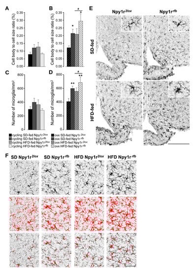 This rapid HFD-induced pro-inflammatory response precedes the HFD-induced weight gain, suggesting that neuroimmune response in the ARC might play a causal role in the pathophysiology of obesity []. Previous studies demonstrated that sex differences in microglial activation in the brain nuclei involved in the modulation of energy homeostasis and estradiol have protective effects against HFD-induced microgliosis in the hypothalamus [,,]. Accordingly, here we report that the HFD increased microglial number and activation in the ARC of ovx, but not of cycling Npy1rrfb females, thus pointing to a role of NPY in the sex-specific control of energy homeostasis.
