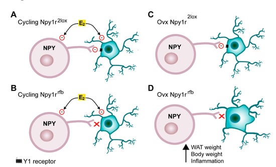 Emerging evidence has indicated that NPY acts as a critical link between the nervous system and immune system and demonstrated that NPY directly modulates immune cells by acting on NPY receptors []. Microglia expresses Y1R and NPY, acting through Y1R, and significantly inhibits microglial activation, phagocytosis and cytokine secretion [,,,]. In Npy1rrfb mice, the conditional inactivation of the Npy1r gene is driven by the alpha-CaMKII promoter, which is expressed specifically in forebrain glutamate positive cells []. Given that microglia express alpha-CamKII [,], we hypothesize that, in the absence of the inhibitory role of gonadal hormones on neuroinflammation, the conditional deletion of the Npy1r gene in microglia results in the activation and proliferation of microglia and, in turn, in the obesity observed in SD- and HFD-fed Npy1rrfb ovx females. In the present study, we did not carry out hormone replacement; thus, our experimental design does not allow the specific impact of each ovarian steroid on body weight increase and microglia activation on ovx females to be defined. However, estradiol emerged as a leading candidate since progesterone replacement does nor revert ovariectomy-induced obesity [] and progesterone receptors are not expressed in microglia in adult mice [] (Figure 6).