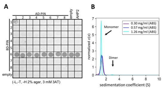 To verify this interaction with another non-yeast-based technique, we also utilized PIN1 HL–1 (see Figure 1) and tested it via analytical ultracentrifugation (AUC). As shown in Figure 2B, the sedimentation velocity experiment indicates the existence of major monomeric (~1.2 S) and minor dimeric (~3S) species. Unfortunately, the presence of dimers could be confirmed only at a higher concentration of PIN1 HL–1 (1.2 mg/mL). It cannot be excluded that such a high concentration of PIN1 HL is also present in the yeast nucleus during the Y2H assay. Notably, the HL–1 sequence was approximately 50% shorter than the entire PIN1 loop (see also Figure 1A) used for Y2H, as the expression levels of the longer loop in bacteria were too low for efficient purification. Therefore, the longer PIN1 HL may interact more strongly in yeast cells as it has additional regions that promote this interaction.