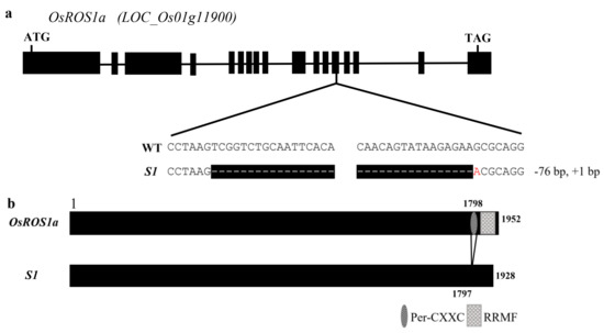 CRISPR/Cas9-induced OsROS1a gene editing. (a) Schematic of OsROS1a gene structure. Exons and introns are denoted as black blocks and lines, respectively. The translation initiation codon (ATG) and the termination codon (TAG) are shown. The recovered mutated allele is shown below the WT reference sequences. The target sites’ nucleotides are indicated in black capital letters. The white dashes indicate the deleted nucleotides, and the substitution nucleotide A is shown in red. (b) The protein structure of WT and the null mutant S1. The predicted structure of WT contained the Per-CXXC domain and RRMF domain, while the Per-CXXC domain is not predicted inthe null mutant S1.