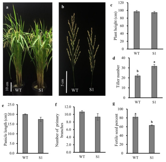 Phenotypes of WT and the S1 mutant. (a) Phenotype comparison of the WT and the S1 mutant(b) The panicle of WT and the S1 mutant. The statistic calculation of agronomic traits of (c) plant height, (d) tiller number, (e) panicle length, (f) number of primary branches, and (g) fertile seed percentage. Lettering indicates statistical significance at p ≤ 0.01. Data are means ± standard deviation (SD) (n = 3).