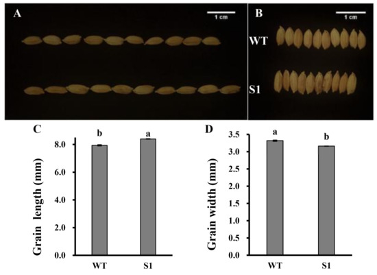 Comparison of seed length (A) and seed width (B), and the statistical analysis of seed length (C) and seed width (D) between WT and the S1 mutant. Lettering indicates statistical significance at p ≤ 0.01. Data are means ± SD (n = 3).