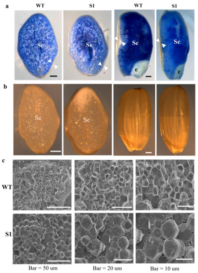 For Evans Blue staining-based half-seed assay, mature grains from WT and the null mutant S1 were dehusked and transversally sectioned into two halves using a razor blade, then dipped in 0.1% (w/v) Evans Blue solution for 10 min, and by using distilled water, were washed three times. All samples were observed and photographed under a dissecting microscope (Nikon). Further, to study the mature seeds’ morphological changes and their starch granules, the WT and the S1 mutant seeds were transversely sectioned. Samples were then examined and photographed by SEM.