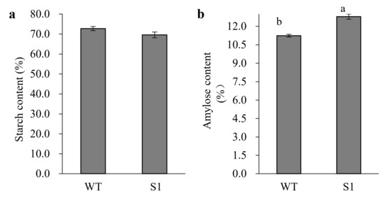 Total starch and amylose content in the mature seed of WT and the S1 mutant. (a) Total starch content in the seeds of WT and S1 mutant. (b) Total amylose content in seeds of WT and S1 mutant. Lettering indicates the statistical difference at p ≤ 0.01. Data are means ± SD with three replicates.