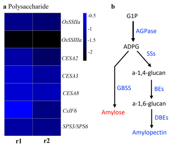 The expression of polysaccharide-related genes and starch synthesis pathway. (a) The heat plot of differential expressed polysaccharide-related genes. (b) The starch synthesis pathway. The downregulated genes were shown in blue colors, amylose in red showed increased content, and amylopectin in blue showed decreased content.