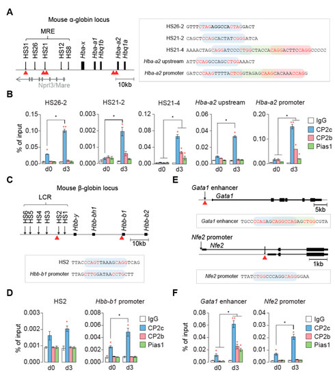 To better understand the differential binding mechanism of two different CP2c complexes, namely tCP2c and CBP, we recalled the binding status of CP2c complex proteins in some regulatory regions of erythroid genes by chromatin immunoprecipitation–quantitative PCR (ChIP-qPCR) during MEL cell differentiation in vitro. Previously, we examined the recruitment of CP2c complex proteins to the regulatory regions by focusing on the Gata1/Fog1-Mbd2/NuRD complex axis [24]. We found that all CP2c complex proteins bind to the endogenous α-globin promoter, and that the extent of binding increased in differentiated MEL cells. Here, we re-examined the binding efficiency of CP2c complex proteins focused on the configuration of CP2c binding motifs (Figure 1). In the mouse α-globin locus, all CBP proteins (CP2c, CP2b, and Pias1) were recruited to the MRE HS21-4 (the fourth fragment in the hypersensitive site 21 region of the α-globin major regulatory element) and to the Hba-a2 promoter, having four consecutive CP2c half-sites (CNRG separated by five or six nucleotides) of a CP2c binding motif (Figure 1A,B).