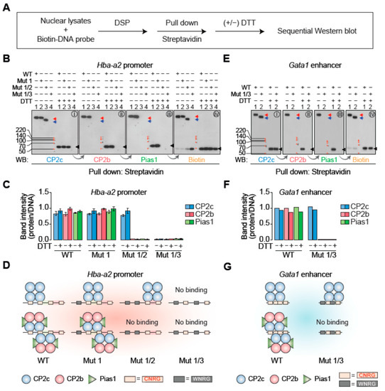 To identify CP2c complexes bound to the target DNA and estimate their stoichiometry, we employed a method using chemical (DSP) crosslinking and Western blotting (DSP XL-WB) (Figure 3A). Since DSP is a disulfide-bond-containing cross-linking reagent and can be chemically cleft by reducing reagent treatment, we could identify components in the crosslinked complex and estimate their stoichiometry when applied to XL-WB. To discriminate the binding of tCP2c and CBP to the probes containing various numbers of consecutive CP2c half-sites, we used biotin-labeled probes of the wild type (WT) Hba-a2 promoter and the selected Mut 1, Mut 1/2, and Mut 1/3 mutants (containing four, three, or two consecutive, or single CP2c half-sites, respectively; see Figure 2B) in the reaction containing 293T nuclear extracts. Assuming all the CBP complexes have the same relative amounts of CP2c, CP2b, and Pias1 [23], the complex composition was estimated by measuring relative band intensities in a sequential Western blot by repeating steps of washing out the probe and reprobing. To obtain a relative value for each complex band, the intensity value measured without DTT treatment was divided by the intensity of the monomer band obtained by DTT treatment. WB analyses of the complexes pulled down with biotin-labeled DNA (using streptavidin bead) identified the same relative amounts of all CP2c complex proteins in the complexes formed with the WT and Mut 1 probes, whereas only CP2c was found in the complex with Mut 1/2, and no protein at all was bound to Mut 1/3 (Figure 3B). Our finding of the same relative amounts of CP2c, CP2b, and Pias1 in the complexes with WT and Mut 1 probes was not different when analyzed after DTT treatment (Figure 3C), and it was consistent with our previous report regarding the existence of the heterohexamer complex containing two units each of CP2c, CP2b, and Pias1 [23]. Here, Pias1 serves as a clamp between two CP2 proteins, while CP2c binds directly to the target DNA and CP2b mediates strong transactivation. Importantly, the relative amounts of CP2c in the CBP complexes formed with the WT and Mut 1 probes were not different from those in the tCP2c (i.e., [C4]) complex with the Mut 1/2 probe (Figure 3B,C), suggesting dimeric CBP complexes (i.e., [C2B2P2]2) bind to the DNA containing three consecutive CP2c half-sites, since tCP2c consists of four CP2cs [22]. Similarly, the same relative amounts of all CP2c complex proteins existed in the complexes with the WT Gata1 enhancer probe containing two staggered CP2c binding motifs, and the amounts of CP2c in the WT probe were not different from those in the Mut 1/3 probe containing a single CP2c binding motif (Figure 3D,E). Taken together, our data indicate that the [C2B2P2]2 binds to the DNA containing either three consecutive CP2c half-sites or two staggered CP2c binding motifs, whereas the [C4] binds to the DNA containing two CP2c consecutive half-sites (or one CP2c binding motif) (Figure 3F). It is important to note here that [C2B2P2]2, but not [C4], was bound to the probes containing three or four consecutive CP2c half-sites where both [C4] and [C2B2P2]2 could theoretically bind.