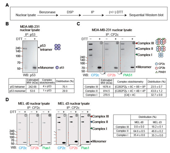 As CP2c solely exists as either a monomeric [C4] or a [C2B2P2]2 in a DNA-bound state, we wondered about the DNA-unbound CP2c states in the nucleus. CP2c was initially identified as a dimer in solution by sedimentation analyses. However, a tetrameric form of CP2c was later observed by Western blot after chemical crosslinking [22]. In addition, the existence of another form of CP2c complex, CBP, was proposed [23]. Therefore, it is still unclear how many kinds of nuclear CP2c complexes exist in solution, and what the stoichiometry of each complex is. We exploited DSP XL-WB assays to identify types of complexes and estimate their stoichiometry and proportions in cells, i.e., we performed sequential Western blotting of proteins immunoprecipitated with specific antibodies to the DSP-crosslinked nuclear extracts (Figure 4A). To obtain a relative value for each complex band, the intensity value measured without DTT treatment was divided by the intensity of the monomer band obtained by DTT treatment. Relative band intensities in a Western blot were used for the estimation of the complex composition, assuming that all of the complexes have the same relative amounts of the different proteins. After obtaining each relative quantitative value from the results of IP and blotting with different antibodies, data were presented as mean ± standard error. The relative amount of the complex was calculated based on the theoretical number of components (CP2a, CP2b, CP2c, and PIAS1) in each complex and used for the estimation of ratios of each complex in cells. The usefulness of this protocol was validated by analyzing the oligomerization status of the p53 tumor suppressor (Figure 4B), which has been known to exist mainly as a homotetramer with a minority of monomer in cells [26].