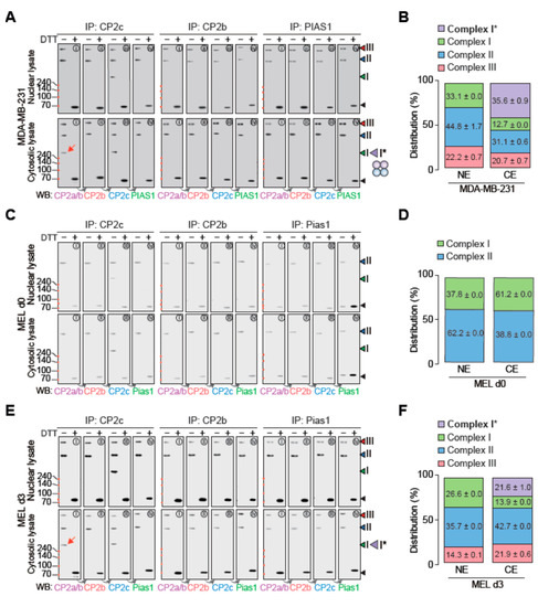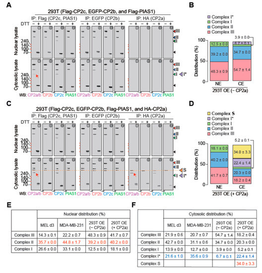 Subcellular distribution and dynamics of various CP2c complexes in cells with overexpression of CP2c complex proteins. (A,B) CP2c complex types and subcellular distribution of each complex in 293T cells where epitope tagged CP2c complex proteins (Flag-CP2c, EGFP-CP2b, and Flag-PIAS1) were ectopically overexpressed. (C,D) CP2c complex types and subcellular distribution of each complex in 293T cells where epitope tagged CP2c complex proteins (Flag-CP2c, EGFP-CP2b, and Flag-PIAS1) and CP2a were ectopically overexpressed. Immunoblots (A,C) showing various CP2c complexes in the nucleus (top) and cytosol (bottom) and the quantified distribution plots of each complex in the nucleus and cytosol (B,D). Red arrows in the immunoblots highlight the existence of CP2a in the cytosol-specific CP2c complex, complex I* ([C2A2]). The red dotted line indicates another cytosolic CP2c complex, complex S that appeared in cells by ectopic overexpression of CP2c complex proteins. Samples were subjected to 10% SDS-PAGE. (E,F) Estimated ratios of each CP2c complex in the nucleus (C) and cytosol (D) in comparison with those of d3 MEL and MDA-MB-231 cells.