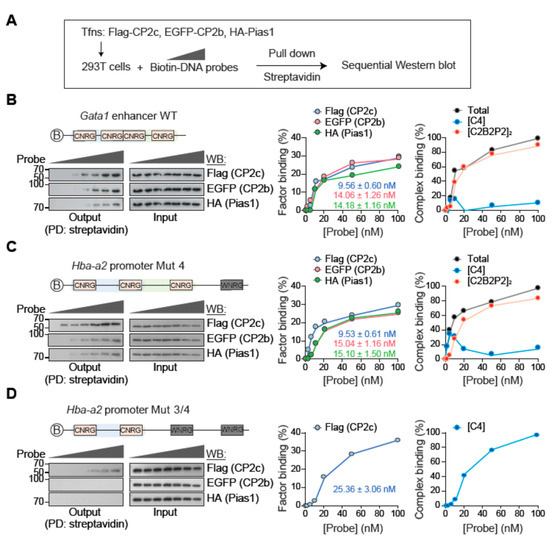 To determine the binding efficiency of [C4] and [C2B2P2]2, we tested binding affinities of [C4] and [C2B2P2]2 to the DNA probes containing various numbers of CP2c half-sites by DIP using biotin-tagged probes and epitope-tagged factors overexpressing 293T nuclear extracts (Figure 7A and Figure S2A). Since [C4] consisted solely of CP2c, whereas [C2B2P2]2 contained CP2b and Pias1 in addition to CP2c, the DNA binding affinities of [C4] and [C2B2P2]2 were estimated by measuring the CP2c and the averaged CP2b and Pias1 binding efficiency. In the Gata1 enhancer probe (having two staggered CP2c binding motifs), although CP2c (Kd of 9.56 ± 0.60 nM) showed a 1.5-fold higher binding affinity than CP2b or Pias1 (14.06 ± 1.26 nM and 14.18 ± 1.16 nM), [C2B2P2]2 surpassed [C4] by increasing probe concentration (Figure 7B). In addition, the same phenomenon occurred in the test using Hba-a2 promoter probes. In the Hba-a2 promoter Mut 4 probe containing three consecutive CP2c half-sites, CP2c (Kd of 9.53 ± 0.61 nM) showed a 1.5-fold higher binding affinity than CP2b or Pias1 (15.04 ± 1.16 nM and 15.10 ± 1.50 nM), but [C2B2P2]2 also surpassed [C4] by increasing probe concentration (Figure 7C). This phenomenon was recapitulated in the tests using a WT Hba-a2 promoter (having four consecutive CP2c half-sites) or a Hba-a2 Mut 1 (having three consecutive half-sites) probe, although the binding affinities of CP2c and CP2b (or Pias1) were somewhat varied, depending on the probe contexts (Figure S2B,C). Therefore, these data suggest that [C4] firstly binds to the sequences, owing to its high binding affinity, and then [C2B2P2]2 replaces [C4] by increasing the probe concentration, owing to its prevalence in the nucleus.