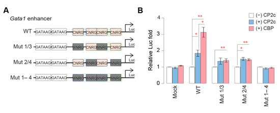 The DNA sequences, containing a CP2c-binding sequence or a mutated CP2c-binding sequence, were synthesized as oligonucleotides (listed in Table S1) for the purposed transactivation activity check by the luciferase assay. Each of the oligonucleotides was mixed and annealed in a TEN buffer (20 mM Tris-HCl, pH 8.0, 100 mM NaCl, and 1 mM EDTA). The oligonucleotides for mouse Gata1 proximal enhancer sequence WT, Mut1/3, Mut 2/4, and Mut 1–4 were cloned into the Xho I and Hind III digested pGL3-promoter vector.