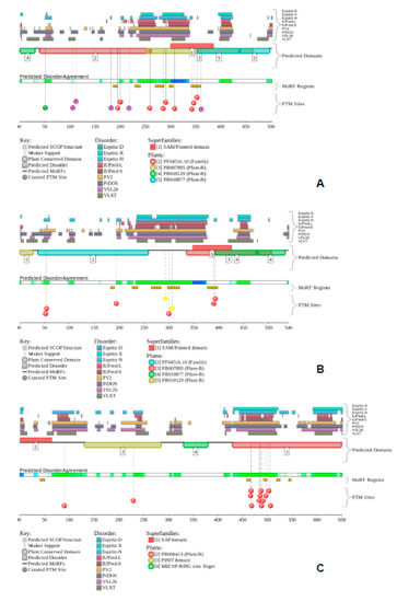 Intrinsic disorder predisposition of mouse CP2c (UniProt ID: Q9ERA0; (A)), CP2b (UniProt ID:Q811S7; (B)), and Pias1 (UniProt ID: O88907; (C)). Functional disorder profiles were generated by the computational platform D2P2 (http://d2p2.pro/, accessed on 3 June 2022), which is a database of disordered protein predictions [40]. In addition to disorder predispositions of query proteins evaluated by IUPred [41], PONDR® VLXT [42], PrDOS [43], PONDR® VSL2B [44,45], PV2 [40], and ESpritz [46], this database is further supplemented by data concerning the location of functional domains, various curated posttranslational modifications, and predicted disorder-based protein binding sites, known as molecular recognition features, MoRFs.
