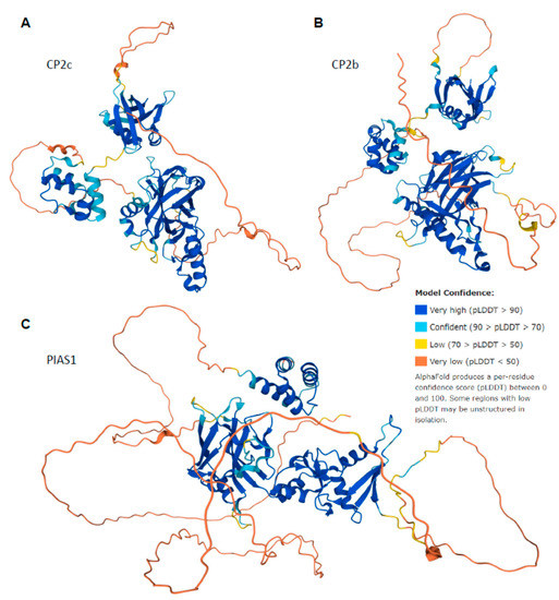 3D structures of CP2c (A), CP2b (B), and Pias1 (C) modeled by AlphaFold. Note that in addition to globular domains (shown by blue and cyan colors) these proteins contain long regions, whose structures are predicted with low or very low confidence (yellow and orange segments), which might be unstructured in isolation.