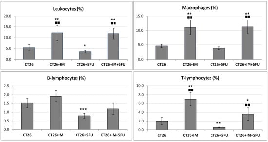 | Total WBCs | C n = 6 | CT26 n = 10 | CT26 + IM n = 10 | CT26 + 5-FU n = 10 | CT26 + IM + 5-FU n = 10 |
