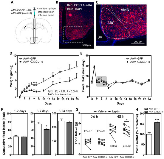 Following a within-subject design, mice (AAV9–GFP and AAV9–CX3CL1-s; n = 7/group) fed with HFD for 28 days and individually housed received daily injections of saline (200 µL/day i.p.) for 2 days followed by daily recombinant murine leptin (2 µg/g body weight i.p.) for 2 days with body weight and food intake measured daily [68,69]. Injections were performed at 10 am and mice were maintained with ad libitum food access during the experiment.