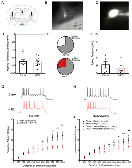 Chronic HFD consumption is associated with hypothalamic microglial activation and alterations in the electrophysiological properties of POMC neurons [4,16,17,19,21,22,34], but a direct connection between these diet-induced responses has not been established. Whole-cell recordings of GFP-labeled POMC neurons in age-matched POMC-MAPT-GFP mice (Figure 2A–C) showed that exposure to HFD for 4 weeks did not alter resting membrane potential (Figure 2D; body weight: Chow 27.65 g ± 0.74 g, N = 11; HFD 33.63 g ± 1.13 g, N = 13; p = 0.003). A similar proportion of POMC neurons were found to be spontaneously active in both chow and HFD-fed mice (~28%; Figure 2E), with equivalent firing rates (Figure 2F). This suggests that neither HFD exposure nor GFP expression resulted in fundamental cellular abnormalities in POMC neurons.