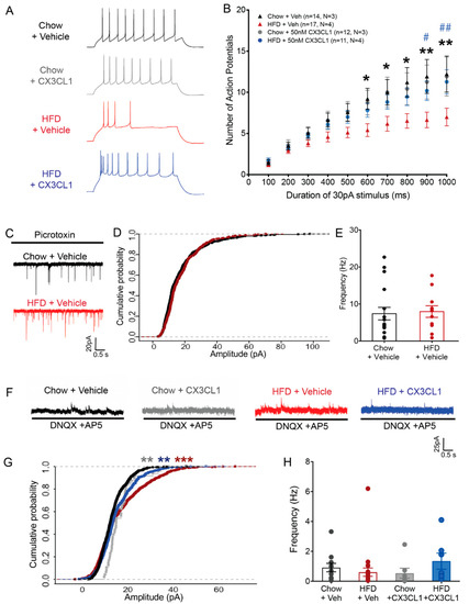 CX3CL1 restores intrinsic excitability of POMC neurons in DIO mice. (A) Representative traces of POMC neurons after stimulation by 1000 ms 30 pA current step (top: stimulus step; bottom: responses: black: Chow + Veh, gray: Chow + CX3CL1, red: HFD + Veh, blue: HFD + CX3CL1). (B) Population data of evoked responses of POMC neurons to variable duration of stimulus after vehicle or CX3CL1 treatment in brain slices from chow and HFD-fed mice (* denotes p values for Chow + Veh and HFD + veh comparison, #, ## denotes p values for HFD + veh and HFD + CX3CL1 comparison). (C–E) Representative traces (C), cumulative probability plot of amplitude (D), and frequency plot (E) of sEPSCs for POMC neurons recorded in chow and HFD brain slices (Frequency of sEPSCs: Chow: 7.41 ± 1.69 Hz, n = 17, N = 3; HFD: 7.96 ± 1.56 Hz, n = 11, N = 3). (F–H) Representative traces (F), cumulative probability plot of amplitude (G), and frequency plot (H) of sIPSCs for POMC neurons recorded in chow and HFD brain slices incubated for 2 h with vehicle or CX3CL1 (Frequency of sIPSCs: Chow + Veh: 0.76 ± 0.28 Hz, n = 18, N = 4; HFD + Veh: 0.61 ± 0.28 Hz, n = 22, N = 4; Chow + CX3CL1 = 0.54 ± 0.33 Hz, n = 7, N = 2; HFD + CX3CL1: 1.3 ± 0.54 Hz, n = 7, N = 2). Lowercase (n) indicates number of neurons and uppercase (N) number of animals. * p < 0.05; ** p < 0.01; *** p < 0.001.