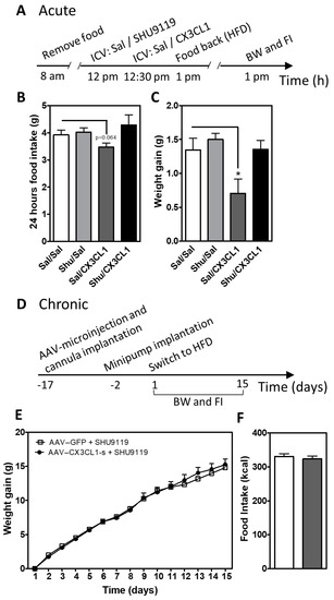 C57BL6/J male mice underwent implantation of an acute injection lateral ventricle (LV) cannula (Plastic One, Roanoke, VA, USA; co-ordinates: 0.7 mm posterior to bregma; 1.3 mm lateral, and 1.3 mm below the skull surface) under isoflurane anesthesia. Mice were given 2 weeks for recovery before i.c.v. administration. On the day of the experiment, four groups: (1) Saline/Saline, (2) SHU9119/Saline, (3) Saline/CX3CL1, (4) SHU9119/CX3CL1) of weight-matched mice were established (n = 5 per group). Food was removed 4 h prior to a first i.c.v. injection with saline or SHU9119 (0.5 nmol in 1µL) followed by a second i.c.v. injection of saline or CX3CL1 (1 µg in 1µL) 30 min later (See time scale in Figure 4A). Animals were then provided HFD, and food intake and body weight were measured after 24 h.