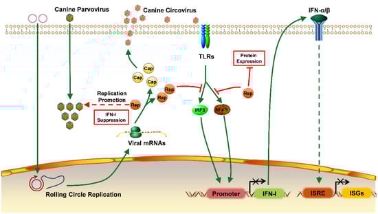 Hao, X.; Li, Y.; Chen, H.; Chen, B.; Liu, R.; Wu, Y.; Xiao, X.; Zhou, P.; Li, S. Canine Circovirus Suppresses the Type I Interferon Response and Protein Expression but Promotes CPV-2 Replication. Int. J. Mol. Sci. 2022, 23, 6382. https://doi.org/10.3390/ijms23126382