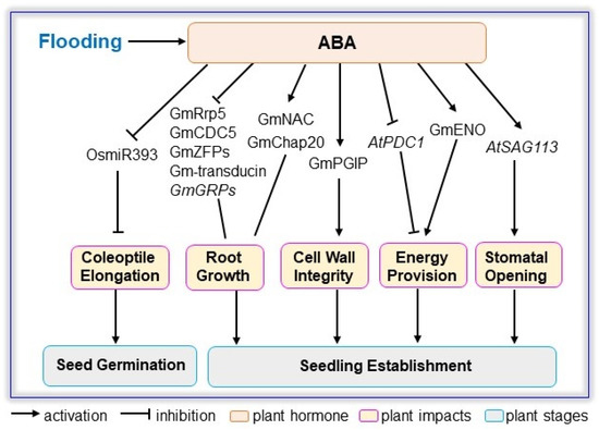 ABA signaling involved in plant response to flooding stress. Flooding alters ABA content with different accumulation patterns. The impact of exogenous ABA on flooded plants during seed germination and seedling establishment are summarized based on reported genes and proteins related to coleoptile elongation, root growth, cell wall integrity, energy provision, and stomatal opening in Arabidopsis, rice, and soybean. ABA, abscisic acid; CDC5, cell division cycle 5; Chap20, chaperone 20; ENO, enolase; GRPs, glycine rich proteins; NAC, nascent polypeptide associated complex; PDC1, pyruvate decarboxylase1; PGIP, polygalacturonase inhibiting protein; Rrp5, RNA binding rRNA processing protein 5; SAG113, senescence-associated gene 113; ZFPs, zinc finger proteins.