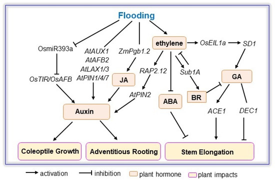 Interplays of GA, ABA, auxin, BR, ethylene, and JA signaling involved in plant response to flooding. The scheme of GA, ABA, auxin, BR, ethylene, and JA signaling associated with coleoptile growth, adventitious rooting, and stem elongation was constructed based on identified genes in Arabidopsis, rice, and maize. Flooding suppresses expression of miR393, which inhibits OsTIR and OsAFB, altering auxin mediated coleoptile growth during seed germination. Although auxin receptors and transports are affected differently by flooding, activation of PIN1/AUX1/AFB2 and suppression of LAX1/LAX3/PIN4/PIN7 improves adventitious rooting through auxin signaling. Meanwhile, gain-of-function of RAP2.12 activates AtPIN2 for auxin transport. The interaction between JA and auxin is evident in the enhancement of JA biosynthesis in plants overexpressing ZmPgb1.2. Flooding induces expression of Sub1A and rice bearing Sub1A presented high amounts of BR, leading to a reduction in GA content. Furthermore, flood-induced ethylene activates OsEIL1a that binds to SD1, leading to an increase in GA, which modulates stem elongation through ACE1 and DEC1. ABA, abscisic acid; ACE1, ACCELERATOR OF INTERNODE ELONGATION1; AFB, auxin signaling F-box; AUX, auxin resistant; BR, brassinosteroid; DEC1, DECELERATOR OF INTERNODE ELONGATION1; EIL1a, ethylene insensitive like1a; GA, gibberellic acid; JA, jasmonic acid; LAX, like AUX; Pgb, phytoglobin; PIN, plasma membrane intrinsic protein; RAP2.12, related to apetala 2.12; SD1, SEMI-DWARF1; Sub1A, Submergence1A; TIR, transport inhibitor resistant.