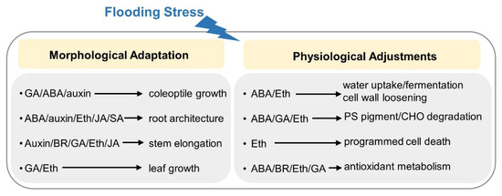 Under flooding stress, plants differentially regulate proteins involved in hormone metabolism, signal transduction, transcriptional control, glucose degradation/sucrose accumulation, alcohol fermentation, gamma-aminobutyric acid shunt, suppression of reactive oxygen species (ROS) scavenging, mitochondrial impairment, ubiquitin/proteasome-mediated proteolysis, and cell-wall loosening [18,19,20]. In some of these events, plants balance the synthesis and transport of phytohormones and regulate the responses to waterlogging via complex signaling processes [21]. These reports indicate that plants can cope with flooding conditions by embracing an orchestrated set of physiological adjustments, which are regulated by an elaborate hormonal signaling network.