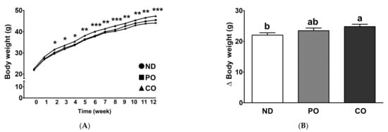 Experimental ob/ob mice were fed ND, ND with PO, or ND with CO for 12 weeks (n = 16 per group). The CO group exhibited a significant increase in BW two weeks after the dietary intervention (Figure 1A, p < 0.05). The final BW of the CO group significantly increased by 1.07-fold at 12 weeks as compared to the other groups, and BW change (ΔBW) increased by 1.13-fold in comparison with ND (Figure 1B). Daily food intake was significantly higher in the CO group than that in the ND group, showing a similar trend to that of ΔBW (Figure 1C, relative ratio 1.09). In contrast, the food efficiency ratio (FER) was intact after dietary intervention, although there was a significant change in ΔBW and daily food intake in the CO group (Figure 1D).