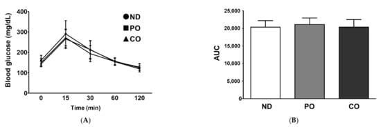 Partial replacement of dietary fat with PO or CO on the fasting glucose and insulin levels in ob/ob mice. Mice were fed either an ND or an ND partially replaced with PO or CO for 12 weeks (n = 16 per group). Mice were injected glucose by oral gavage and blood glucose levels were measured at 0, 15, 30, 60 and 120 min after glucose injection; oral glucose tolerance test (OGTT) (1 g/kg body weight). Insulin tolerance test (ITT) was performed after feeding the experimental diet and blood glucose levels were measured at 15, 30, 60, 120 min after insulin administration (1 U/kg body weight). (A) OGTT at 11 weeks; (B) area under the curve (AUC) of OGTT; (C) ITT at 11 weeks; (D) AUC of ITT. Values are presented as the mean ± standard deviation. Data were analyzed using one-way ANOVA followed by Tukey’s post hoc test.