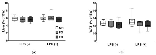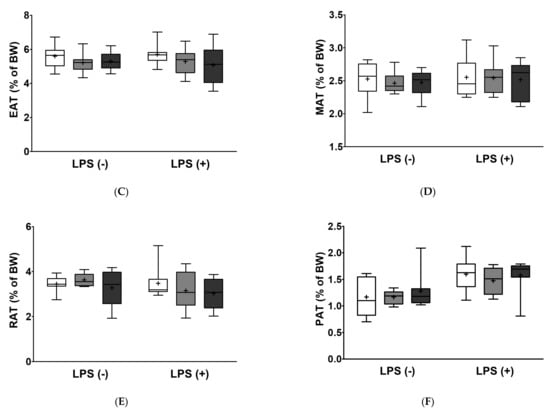 LPS were injected 24 h before sacrifice, and the relative weights of the liver and adipose tissues, including the sum of weight of ATs, epididymal AT (EAT), mesenteric AT (MAT), retroperitoneal AT (RAT), and perirenal AT (PAT) were measured. Overall, there was no significant difference in the tissue weights after dietary treatment (Figure 3).