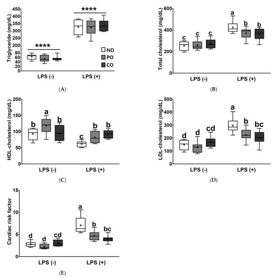 Partial replacement of dietary fat with PO or CO and LPS challenge on serum lipid profiles in ob/ob mice. Mice were fed either an ND or an ND partially replaced with PO or CO for 12 weeks and then treated with PBS or LPS (1 mg/kg) for 24 h (n = 8 per group). (A) Triglyceride levels; (B) total cholesterol levels; (C) high density lipoprotein (HDL)-cholesterol levels; (D) low density lipoprotein (LDL)-cholesterol levels; (E) cardiac risk factor (CRF). Values are presented as box and whisker plots representing 8 mice per group. Data were analyzed using two-way ANOVA followed by Tukey’s post hoc test (LPS × Diet interaction). Asterisk indicates a significant main effect for LPS (****p < 0.0001). Labeled means without a common letter differ (p < 0.05).