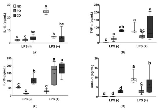 Partial replacement of dietary fat with PO or CO and LPS challenge on the pro/anti-inflammatory cytokines, chemokine in serum. Mice were fed either an ND or an ND partially replaced with PO or CO for 12 weeks and then treated with PBS or LPS (1 mg/kg) for 24 h (n = 8 per group). (A) Interleukin (IL)-1β levels; (B) tumor necrosis factor (TNF)-α levels; (C) IL-10 levels; (D) C-X-C Motif Chemokine Ligand 1 (CXCL-1) levels. Values are presented as box and whisker plots representing 8 mice per group. Data were analyzed using two-way ANOVA followed by Tukey’s post hoc test (LPS × Diet interaction). Labeled means without a common letter differ (p < 0.05).