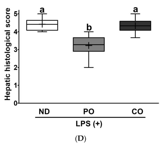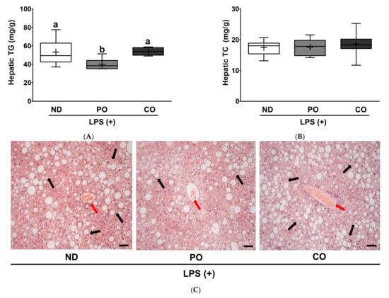 Partial replacement of dietary fat with PO or CO and LPS challenge on lipid contents and histology analysis in liver. Mice were fed either an ND or an ND partially replaced with PO or CO for 12 weeks and then treated with LPS (1 mg/kg) for 24 h (n = 8 per group). (A) Hepatic triglyceride (TG) levels; (B) hepatic total cholesterol (TC) levels; (C) H&E staining of liver tissue (bar = 50 μm, 20 × magnification); (D) histological scores of liver tissue. Values are presented as box and whisker plots representing 8 mice per group. Data were analyzed using one-way ANOVA followed by Tukey’s post hoc test. Black arrow represents lipid droplet and red arrow represents lobular inflammation. Labeled means without a common letter differ (p < 0.05).