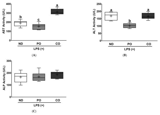 Partial replacement of dietary fat with PO or CO and LPS challenge on hepatic function parameters in serum. Mice were fed either an ND or an ND partially replaced with PO or CO for 12 weeks and then treated with LPS (1 mg/kg) for 24 h (n = 8 per group). (A) Aspartate aminotransferase (AST) activity; (B) alanine aminotransferase (ALT) activity; (C) alkaline phosphatase (ALP) activity. Values are presented as box and whisker plots representing 8 mice per group. Data were analyzed using one-way ANOVA followed by Tukey’s post hoc test. Labeled means without a common letter differ (p < 0.05).