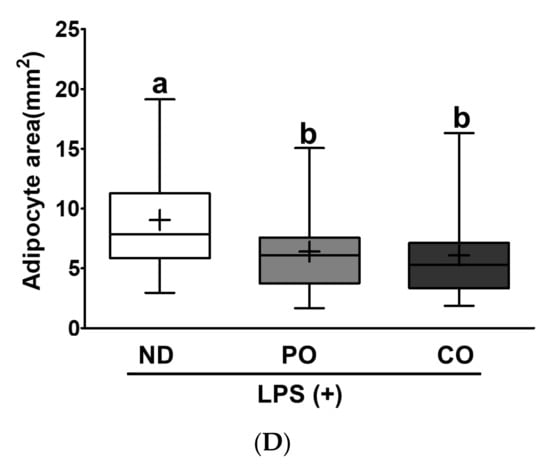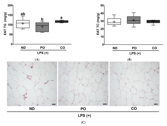 Partial replacement of dietary fat with PO or CO and LPS challenge on lipid contents and histology analysis in EAT. Mice were fed either an ND or an ND partially replaced with PO or CO for 12 weeks and then treated with LPS (1 mg/kg) for 24 h (n = 8 per group). (A) Triglyceride (TG) levels in EAT; (B) total cholesterol (TC) levels in EAT. (C) H&E staining of adipose tissue (bar = 50 μm, 20× magnification); (D) adipocyte area (mm2). Values are presented as box and whisker plots representing 8 mice per group. Data were analyzed using one-way ANOVA followed by Tukey’s post hoc test. Labeled means without a common letter differ (p < 0.05).