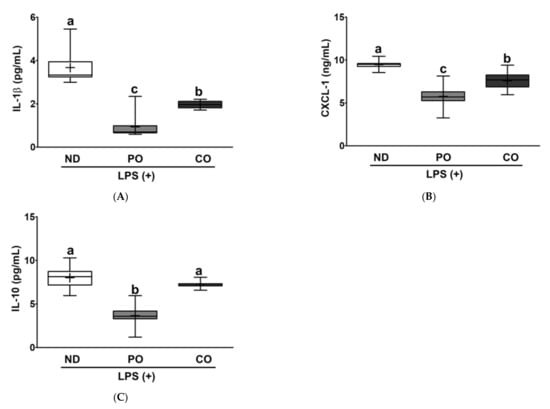 Partial replacement of dietary fat with PO or CO and LPS challenge on pro/anti-inflammatory cytokines, chemokine in EAT. Mice were fed either an ND or an ND partially replaced with PO or CO for 12 weeks and then treated with LPS (1 mg/kg) for 24 h (n = 8 per group). (A) Interleukin (IL)-1β levels; (B) C-X-C Motif Chemokine Ligand 1 (CXCL-1) levels; (C) IL-10 levels. Values are presented as box and whisker plots representing 8 mice per group. Data were analyzed using one-way ANOVA followed by Tukey’s post hoc test. Labeled means without a common letter differ (p < 0.05).