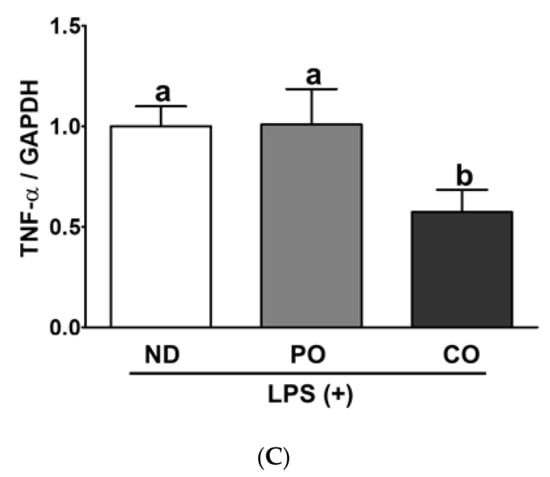 Partial replacement of dietary fat with PO or CO and LPS challenge on mRNA expression related to inflammation in EAT. Mice were fed either an ND or an ND partially replaced with PO or CO for 12 weeks and then treated with LPS (1 mg/kg) for 24 h (n = 8 per group). (A) Interleukin (IL)-6 levels; (B) IL-1β levels; (C) tumor necrosis factor (TNF)-α levels. The expression of each protein was normalized to a value for glyceraldehyde 3 phosphate dehydrogenase (GAPDH). Relative expression of each gene was quantified by using the 2−ΔΔCT method. Values are presented as the mean ± standard deviation. Data were analyzed using one-way ANOVA followed by Tukey’s post hoc test. Labeled means without a common letter differ (p < 0.05).