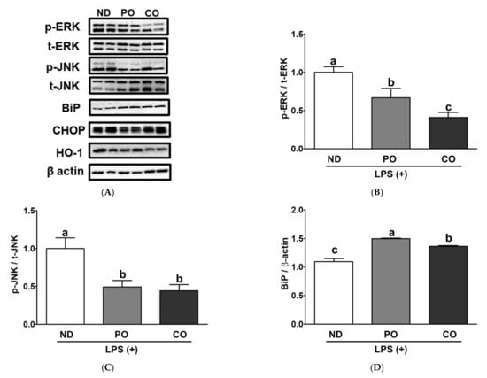 Inflamed adipocytes in obese subjects may trigger other cellular stresses (i.e., ER and/or oxidative stress) via transcriptional and/or post-translational regulatory processes [40,41]. In our previous study, PO and/or CO attenuated systemic inflammation and hepatic fibrosis [34]. Therefore, we hypothesized that PO and CO could suppress inflammatory responses and inflammation-triggered ER or oxidative stress in adipocytes. Mitogen-activated protein kinases (MAPKs) signaling is regulated by an outer stimulus via phosphorylation in a post-translational manner and is involved in multiple cellular responses (i.e., inflammation, ER stress, and/or oxidative stress) [7,42,43]. PO and CO inhibited IL-6 mRNA levels by 62% and 87%, respectively, in comparison with ND (Figure 10A). TNF-α and IL-1β mRNA expression levels were lower in the CO group than those in the ND and PO groups (Figure 10B,C). PO decreased pro-inflammatory cytokines in the system and WAT, but there was no transcriptional deduction in WAT; therefore, we assume that PO may modulate WAT inflammation in a post-translational manner. PO and CO decreased the phosphorylation of extracellular signal-regulated kinase (ERK) by 0.66- and 0.41-fold, respectively, after LPS injection (Figure 11A,B). Phosphorylation of c-Jun N-terminal kinase (JNK) was also decreased by 34.0% and 59.0% by PO and CO, respectively, after LPS-injection (Figure 11A,C). These results indicated that PO and CO decreased phosphorylation of MAPKs, which was a possible signaling pathway to reduce LPS-inducible inflammatory responses in our experimental setting, as we demonstrated previously [34] (Figure 9 and Figure 10). Prolonged inflammation may trigger other pathophysiological disorders, such as ER stress; therefore, the reduction in inflammatory responses by PO and CO may decrease ER stress in WAT. However, enigmatically, the ER chaperone in the PO and CO groups increased binding immunoglobulin protein (BiP, Hsp70 chaperone) expression compared to that in the ND group after LPS injection (Figure 11D). However, C/EBP homologous protein (CHOP, nuclear ER stress regulator) was relatively lowered in PO than others (Figure 11E). Interestingly, HO-1 (oxidative-sensor protein) protein levels were also decreased in the CO group after LPS treatment (Figure 11F). PO may also possess antioxidative effects; however, structural instability may increase the oxidative demand in mitochondria [44]. These results implied that the potential underlying mechanisms mitigated by PUFAs include MAPKs, ER stress, and oxidative stress triggered by LPS injection.