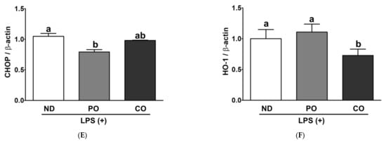 Partial replacement of dietary fat with PO or CO and LPS challenge on the protein expression of inflammatory responses in EAT. Mice were fed either an ND or an ND partially replaced with PO or CO for 12 weeks and then treated with LPS (1 mg/kg) for 24 h (n = 8 per group). (A) Representative Western blot images; (B) phospho-extracellular signal-regulated kinase (p-ERK) levels; (C) phospho-c-Jun N-terminal kinase (p-JNK) levels; (D) binding immunoglobulin protein (BiP) levels; (E) C/EBP homologous protein (CHOP) levels; (F) heme oxygenase 1 (HO-1) levels. The expression of each protein was normalized to a value for β-actin, the internal control of protein content. Values are presented as the mean ± standard deviation. Data were analyzed using one-way ANOVA followed by Tukey’s post hoc test. Labeled means without a common letter differ (p < 0.05).