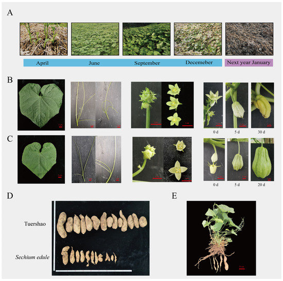 ‘Tuershao’ chayote plants were cultivated in Ya’an City, Sichuan Province (30°06′ N, 102°75′ E), which sprouted in April and completely senesced in January of the following year (Figure 1A). The morphological features of ‘Tuershao’ (Figure 1B,C) are similar to those of the traditional cultivated S. edule. The leaves of ‘Tuershao’ and S. edule are ovate-cordate to suborbicular and contain three to four separate tendrils. The flowers of ‘Tuershao’ and S. edule are unisexual (Figure 1B,C) and contain both male and female reproductive organs on the same plant. The male flowers of ‘Tuershao’ and S. edule are clustered and contain four to five stamens and petals.