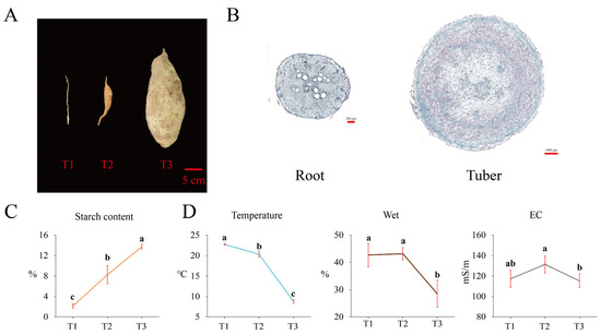 Tubers at three different growth stages (T1, T2, and T3) are shown in Figure 2A. The microscopy of samples collected at stages T1 and T2 (Figure 2B) revealed high starch accumulation during tuberization. We determined starch content at three stages (Figure 2C), which significantly increased during tuber formation and reached 13.76% (on fresh weight, FW, basis) at stage T3. Additionally, we measured the physical properties of the soil (Figure 2D) at the same three stages. Soil temperature significantly decreased with time, and soil moisture at T3 was significantly lower than that at either T1 or T2. Thus, we speculate that low temperature might contribute to the starch accumulation and tuber formation.