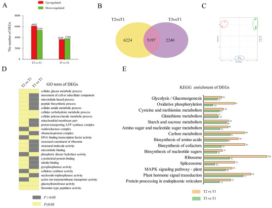RNA-seq analysis of tubers at three different growth stages. DEGs in different comparisons (A); red bars represent upregulated genes and green bars represent downregulated genes. Venn diagram of DEGs in different comparisons (B). PCA analysis of samples at different growth stages (C). GO enrichment analysis of DEGs (D). Number of DEGs in each KEGG pathway (E).