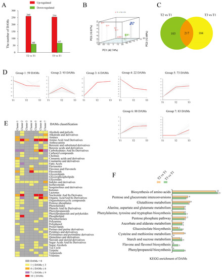 To compare the metabolite contents in ‘Tuershao’ tubers at different stages of growth, we analyzed tuber samples by HPLC-MS/MS at three sampling time points (T1, T2, and T3). Metabolites at T2 and T3 were analyzed for comparison with those at T1, and we set |Log2 (foldchange)| ≥ 1, p-value < 0.05, and VIP (variable importance in project) ≥ 1 as thresholds for differentially accumulated metabolites (DAMs). A total of 320 and 321 DAMs were identified between T2 vs. T1 and T3 vs. T1, with 260 and 254 upregulated DAMs and 60 and 67 downregulated DAMs, respectively (Figure 4A). The PCA (Figure 4B), showed that tuber samples from the three different growth stages were separated by PC1 (42%), PC2 (12%), and PC3 (10%). The Venn diagram showed 217 DAMs at stages T2 and T3, compared to T1 (Figure 4C).
