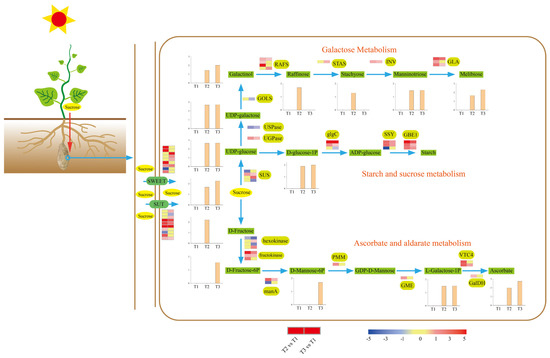 In addition to carbohydrate metabolism, sucrose was converted to ascorbate, which was upregulated during tuberization via ascorbate and aldarate metabolism (Figure 6). Fourteen DEGs were identified to participate in ascorbate biosynthesis, most of which (78.6%) were upregulated at T2 and T3 (Figure 6). These results revealed a transformed network from sucrose to other nutritional metabolites.