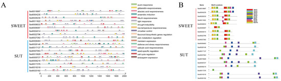Cis-acting elements analysis (A) and protein conserved motif (B) of SWEET and SUT genes.