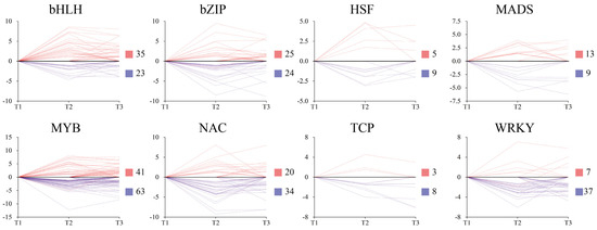 Transcription factors (TFs) participate in multiple plant growth and developmental processes. We scanned RNA-Seq data and identified 356 differentially expressing TFs from 8 TF families during tuber formation (Figure 8). Among these 8 TF families, MYB (60.6%), WRKY (84.1%), NAC (62.9%), and TCP (72.7%) exhibited downregulation during tuber formation. In contrast, more than half of the TFs from the bHLH (60.3%) and MADS-box (59.1%) families were upregulated.