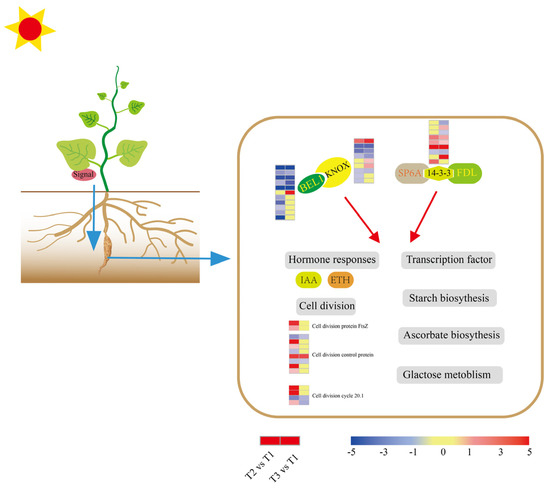 To identify the signal that mediates ‘Tuershao’ tuberization, we referenced the protein regulators of tuber formation in potatoes. Eleven BELLRINGER-1-like (BEL1) TFs were identified, with ten downregulated at T2, five downregulated and one upregulated at T3 (Figure 9). In plants, BEL1-like proteins function in a tandem complex with KNOTTED1-LIKE HOMEOBOX (KNOX) proteins. Nine KNOX TFs were identified, with six downregulated and one upregulated at T2, four downregulated, and three upregulated at T3. The 14-3-3 potato protein blocks flowering and promotes tuberization. Nine DEGs encoding 14-3-3 proteins were identified, with four upregulated and one downregulated at T2, and five upregulated and three downregulated at T3. Fourteen DEGs related to cell division were identified, including cell division protein FtsZ, cell division cycle 20.1, and cell division control protein (CDCP). Among them, DEGs encoding cell division protein and cell division control protein were mainly (71.4%) upregulated during the initiation of tuberization.