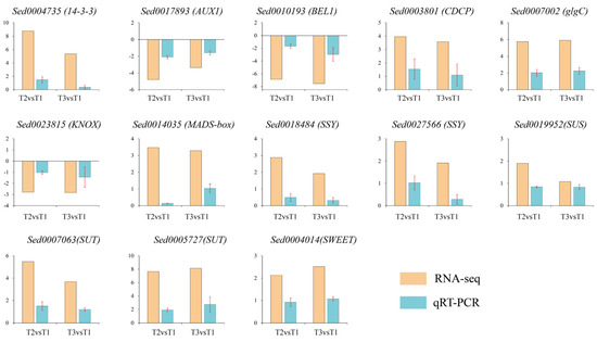 To confirm the RNA-seq results, thirteen DEGs that have different roles in ‘Tuershao’ tuber formation were selected. A significant correlation was observed between the qRT-PCR and RNA-seq results (Figure 10), indicating that reliable RNA-seq data were obtained from the samples.